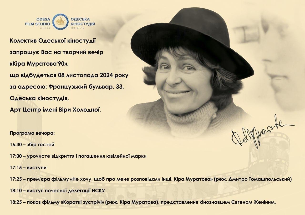 8 листопада на кіностудії покажуть присвяченій видатній режисерці фільм "Не хочу, щоб про мене розповідали інші. Кіра Муратова", а кінознавець Євген Женін представить глядачам фільм самої майстрині "Короткі зустрічі".