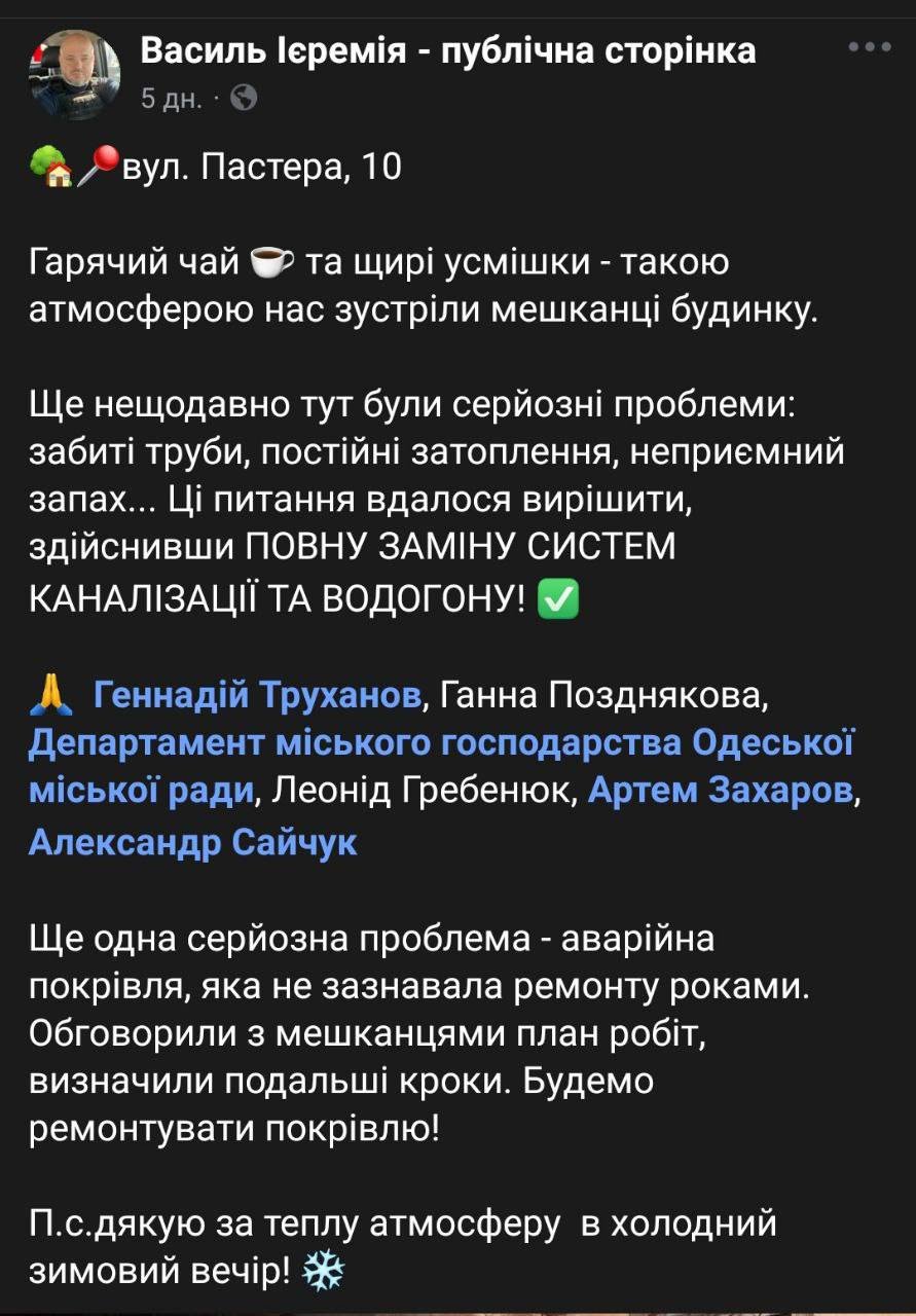 Про це на своїй сторінці у Facebook повідомив депутат Одеської міськради, член фракції «Довіряй ділам» Василь Ієремія.