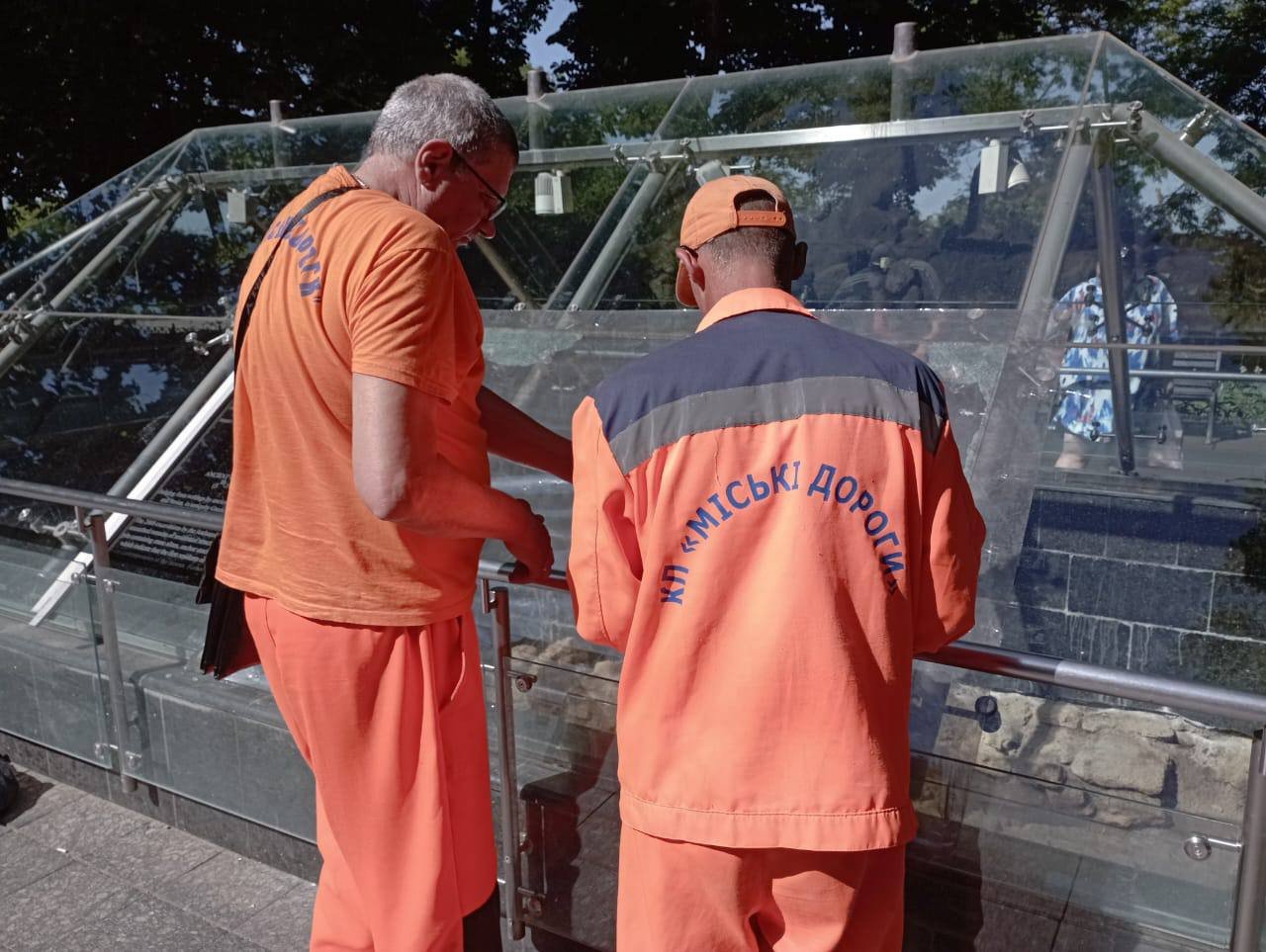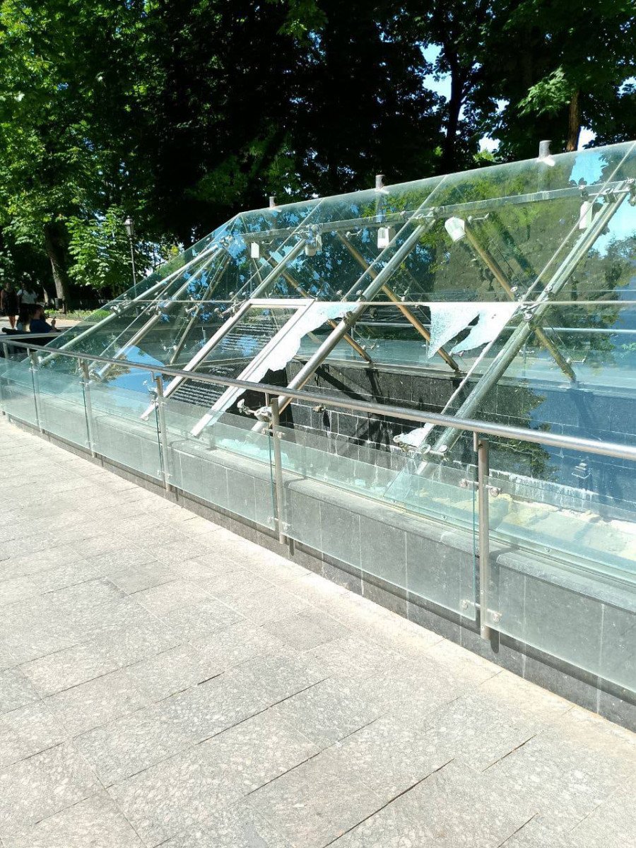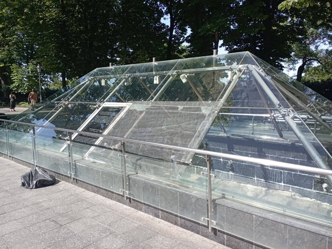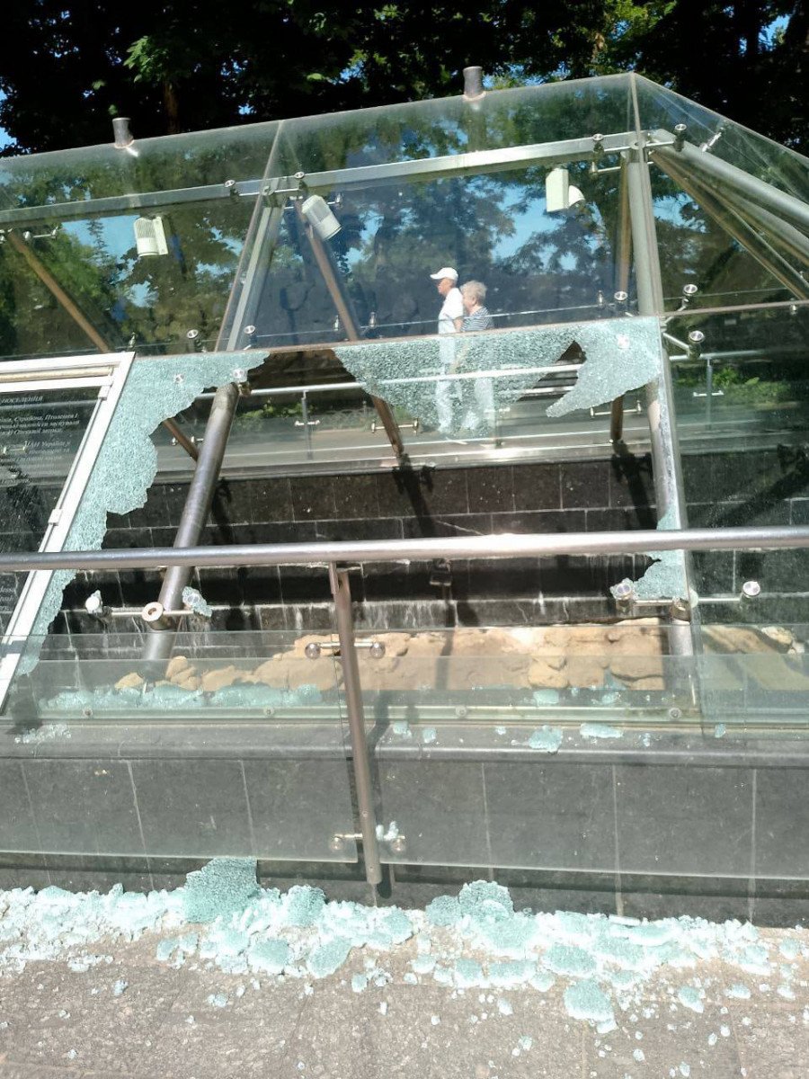 Наразі працівники Комунального підприємства «Міські дороги» закрили саркофаг плівкою та прибрали бите скло.