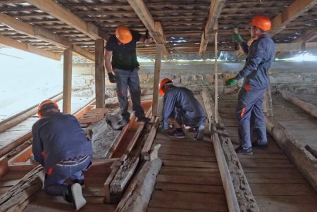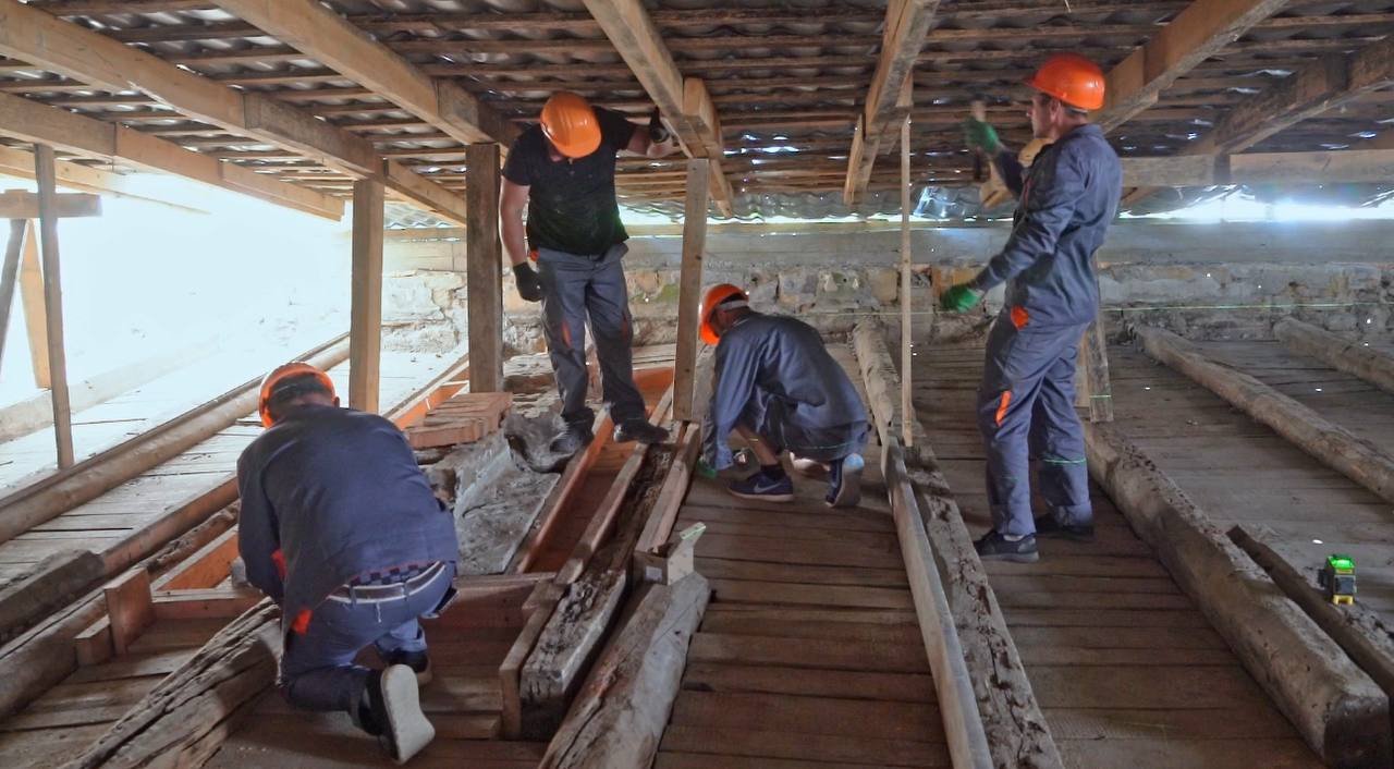 Наразі на об’єкті вже виконано укріплення стін першого поверху, улаштовано залізобетонне перекриття над аркою, зведено монолітні пояси, а також проведено капітальний ремонт близько 4,5 тисяч квадратних метрів покрівлі.