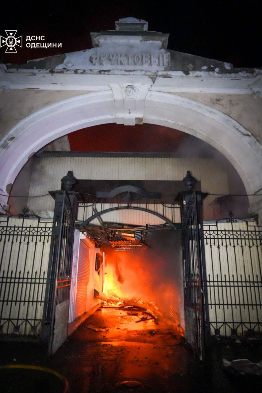 На території ринку “Привоз” рятувальники ліквідували пожежу двоповерхової будівлі й торгівельних павільйонів, що виникли внаслідок російських ударів.