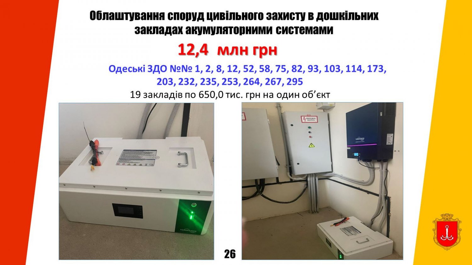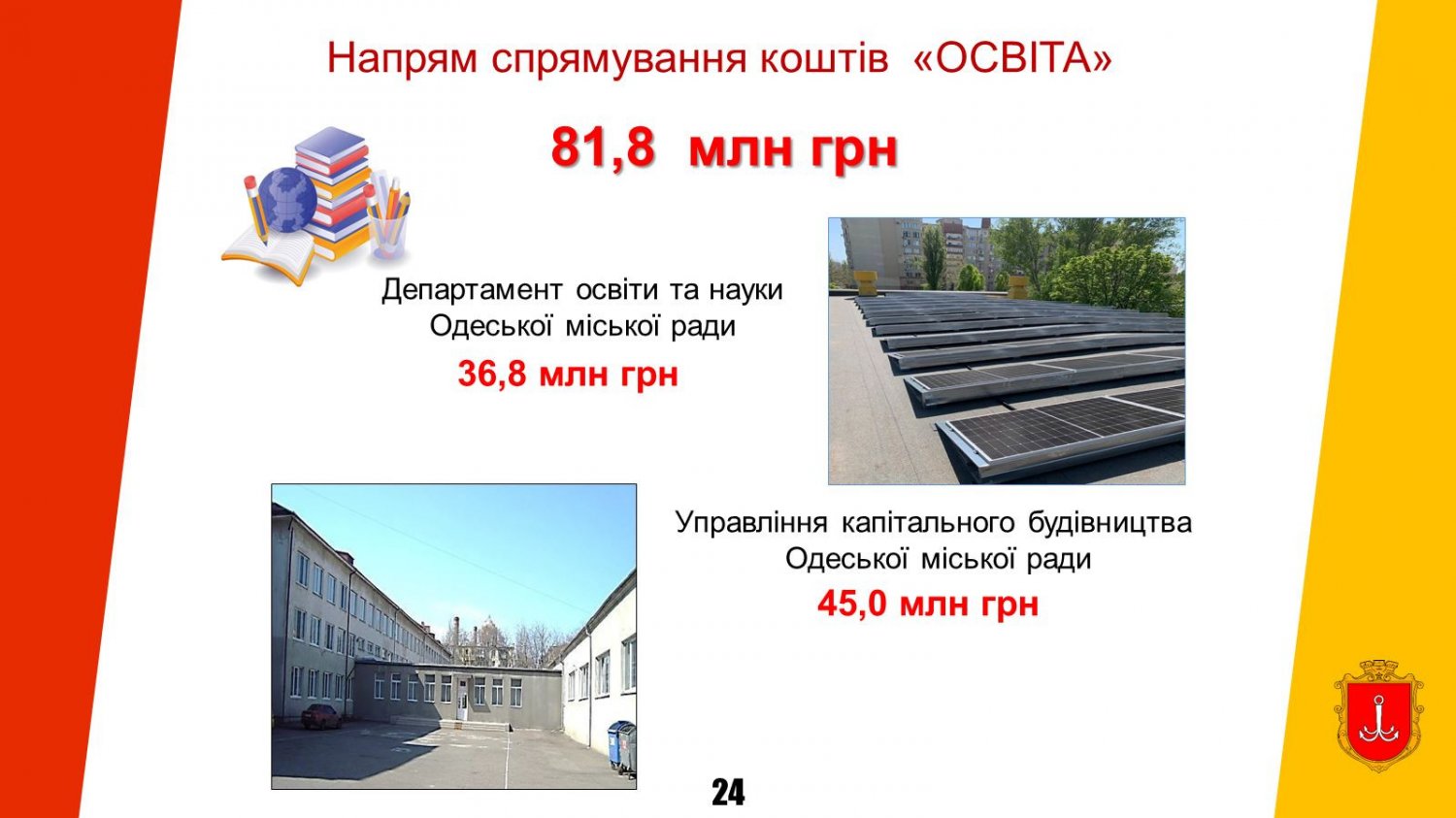 - «Освіта» – 81,7 млн грн (облаштування укриттів, модернізація захисних споруд, протипожежні заходи);