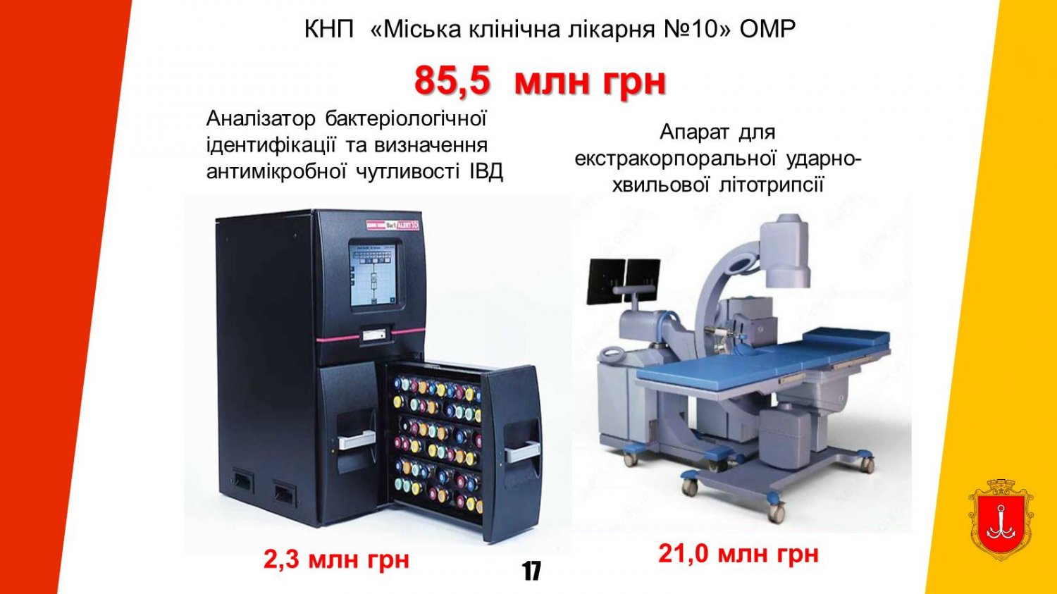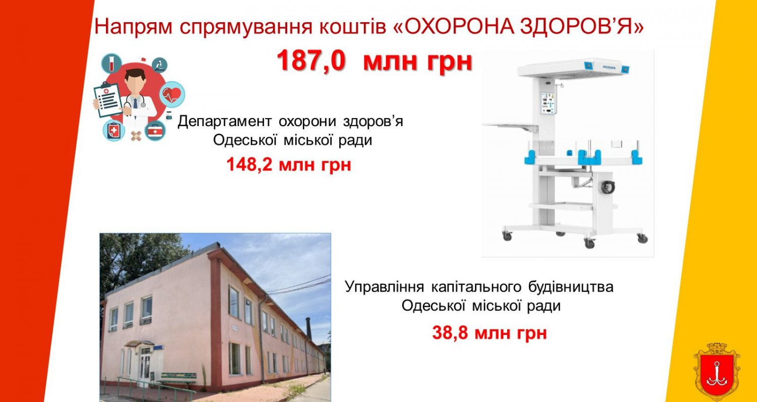 - «Охорона здоров’я» – 186,9 млн грн (сучасне обладнання для лікарень, ремонт інженерних мереж інфекційної лікарні);