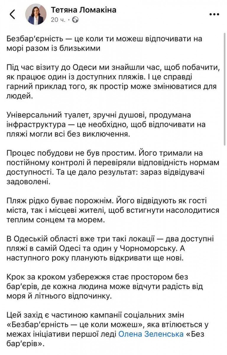 Цей інклюзивний пляж - гарний приклад того, як простір може змінюватися для людей. Про це заявила радниця-Уповноважена Президента України з питань безбар’єрності Тетяна Ломакіна за підсумками візиту до Одеси. Радниця відвідала муніципальний інклюзивний пляж на 11-й станції Великого Фонтану та високо оцінила роботу, яку було проведено містом з облаштування пляжу. Як зазначила Тетяна Ломакіна, процес побудови тримали на постійному контролі й перевіряли відповідність нормам доступності.