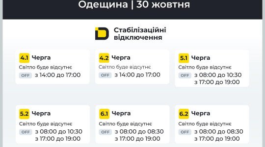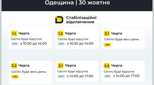 Як повідомляє прес-служба Одеської міської ради, згідно з розпорядженням НЕК «Укренерго», від сьогодні на Одещині запроваджуються стабілізаційні графіки відключень електроенергії.