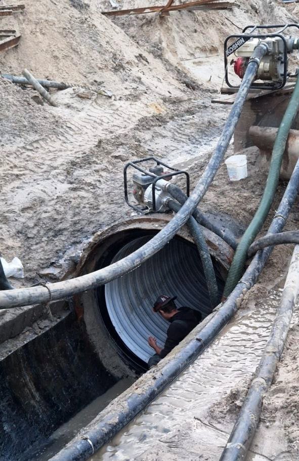 Виконання робіт ускладняються несприятливими погодніми умовами, під час дощу забруднені зливові стоки потрапляють через відремонтовану частину наявного трубопроводу на ділянку виконання робіт. Крім того, ділянка виконання робіт знаходиться значно нижче від рівня моря, тому відбувається її періодичне затоплення морською водою під час шторму, у зв’язку з чим підрядною організацією виконуються заходи щодо скиду води з ділянки виконання робіт в море за допомогою мотопомп.