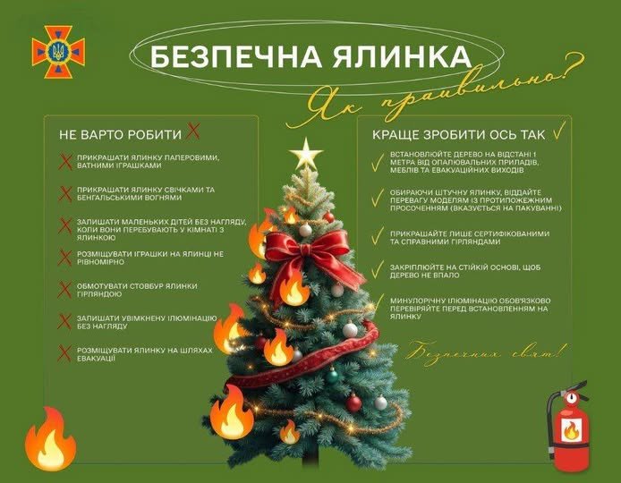 Фахівці ДСНС рекомендують встановлювати новорічну ялинку на стійкій основі з негорючих матеріалів, дотримуючись безпечної відстані від опалювальних приладів і легкозаймистих предметів. Ялинку не слід розміщувати у проходах, біля виходів або на шляхах евакуації. Для оздоблення необхідно використовувати лише справні сертифіковані електрогірлянди без пошкоджень ізоляції, які не варто залишати увімкненими без нагляду.