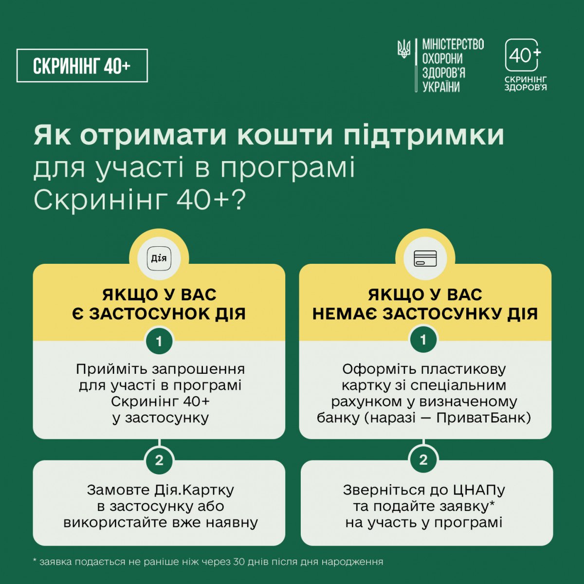 Пройти обстеження також можна — достатньо замовити пластикову картку зі спеціальним рахунком у банку-партнері та звернутися до найближчого ЦНАПу. Адміністратори допоможуть подати заявку і прив’язати рахунок для виплати.