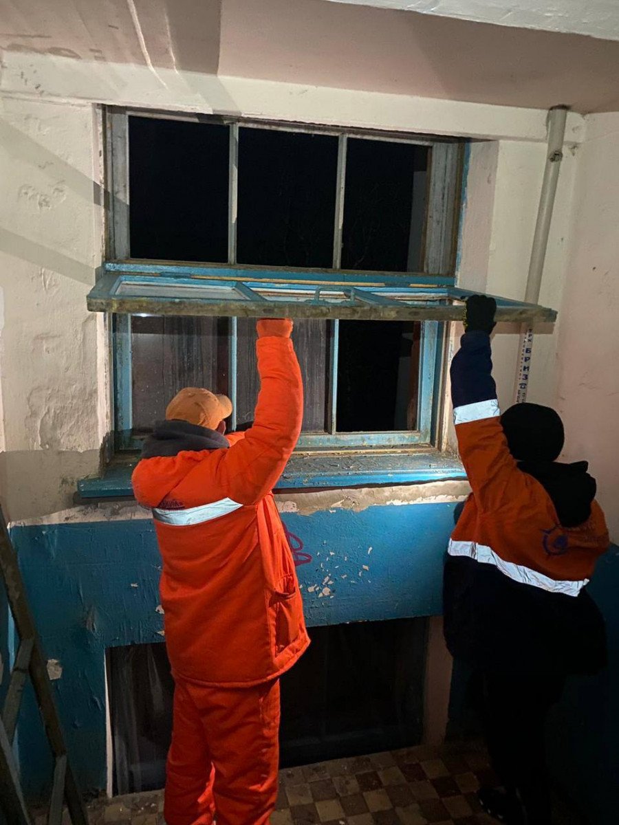 Працівники «ЖКС» проводять закриття вибитих вікон.