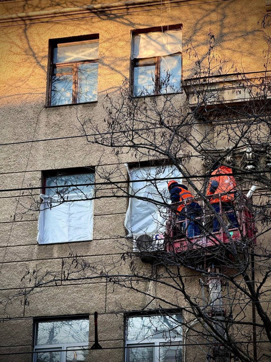 Комунальні служби закривають вибиті вікна плівкою та плитами OSB.