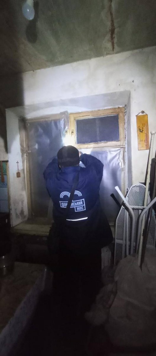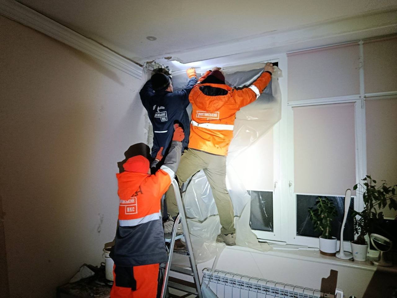 На місцях з ночі працюють комунальні служби. Фахівці ліквідовують наслідки атаки, прибирають уламки та закривають віконні отвори плівкою.