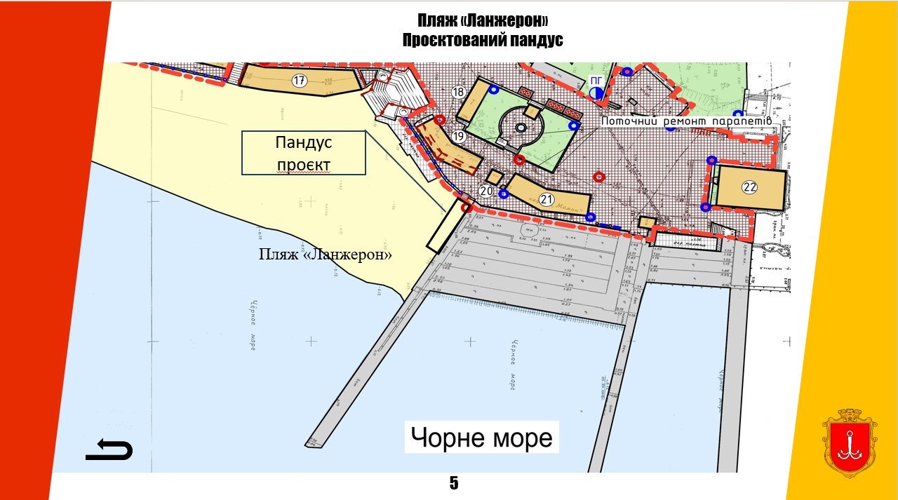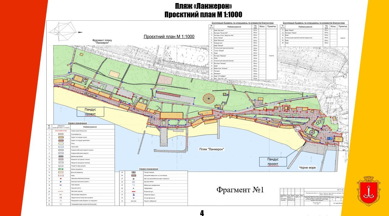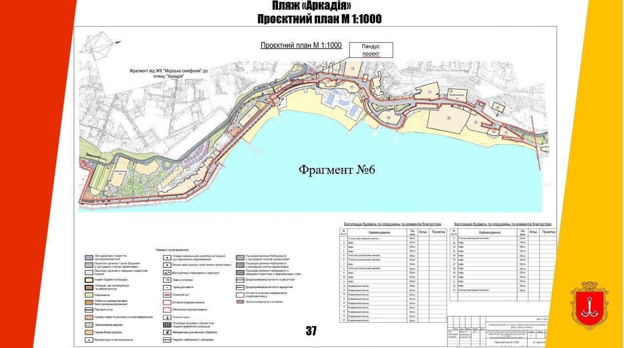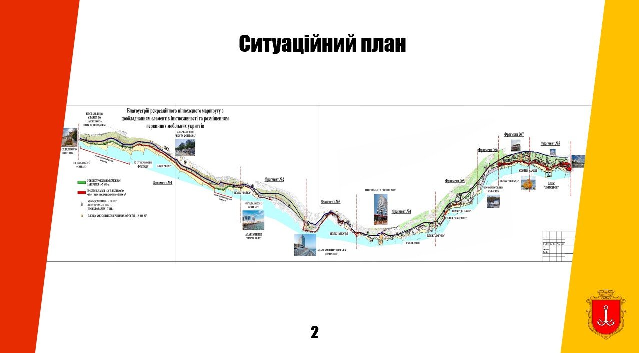 Новий документ уніфіковує всі елементи — від тротуарної плитки, лавок і освітлення до підпірних стінок та елементів безбар’єрності. Зокрема, до 12 наявних пандусів за проєктом додадуть ще 6, а також приведуть до ладу наявні підйомники.